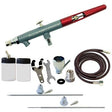 MIL airbrush with cut-out anodized aluminum handle with medium size 3 head, Sizes 1 & 5 Heads, 1 oz bottle assembly, 1/4oz metal cup, 1 oz storage bottle, 1/8"BSP Adapter, 6′ braided hose, hanger, and a  wrench.