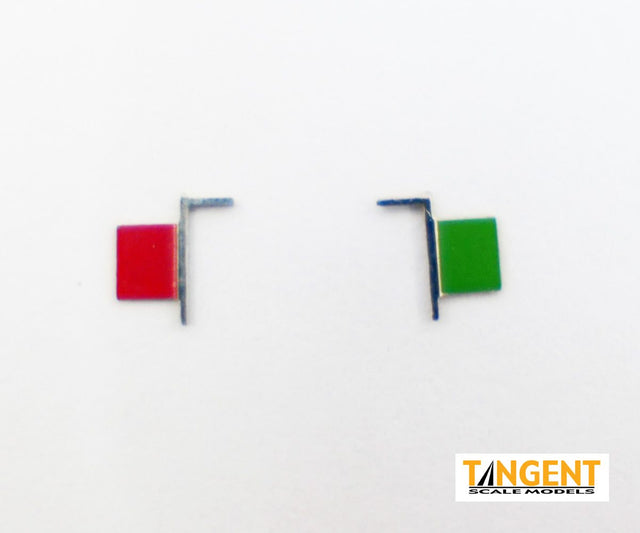 Caboose Flags – Type 3 is a pack of eight (8) metal “flag” paddles used on cabooses for daytime running. This pack contains 2 styles of rectangular flags as used by BN in the 1970s and 1980s. The painted metal parts are red on one side and green on the other, matching the prototypes, and have a mounting stem for a customer-drilled #76 hole. A great update for any BN family caboose!