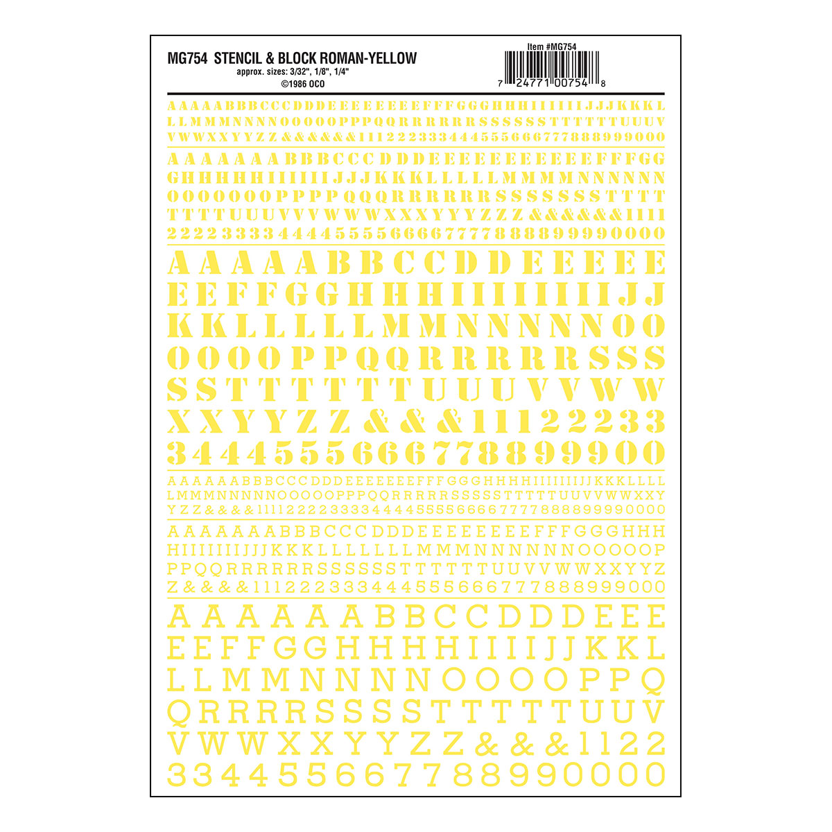 Woodland Scenics Dry Transfer Alphabet & Numbers - Stencil/Block Roman -- Yellow - WOOMG754