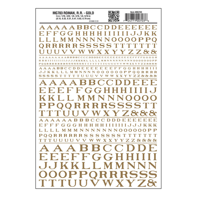 Woodland Scenics Dry Transfer Alphabet - Railroad Roman - 1/16, 3/32, 1/8, 3/16, 1/4 & 5/16" -- Gold - WOOMG703