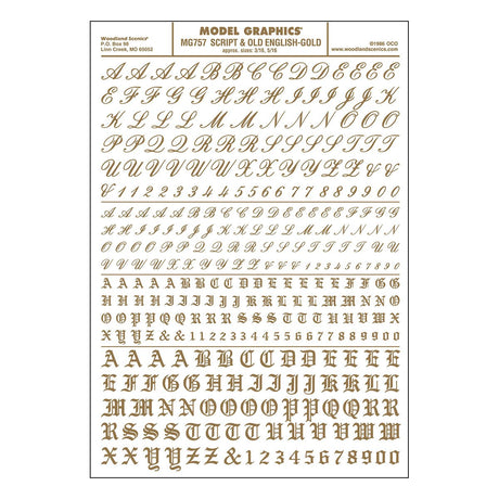 Woodland Scenics Dry Transfer Alphabet & Numbers - Script/Old English -- Gold - WOOMG757