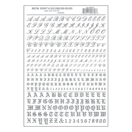 Woodland Scenics Dry Transfer Alphabet & Numbers - Script/Old English -- Silver - WOOMG758