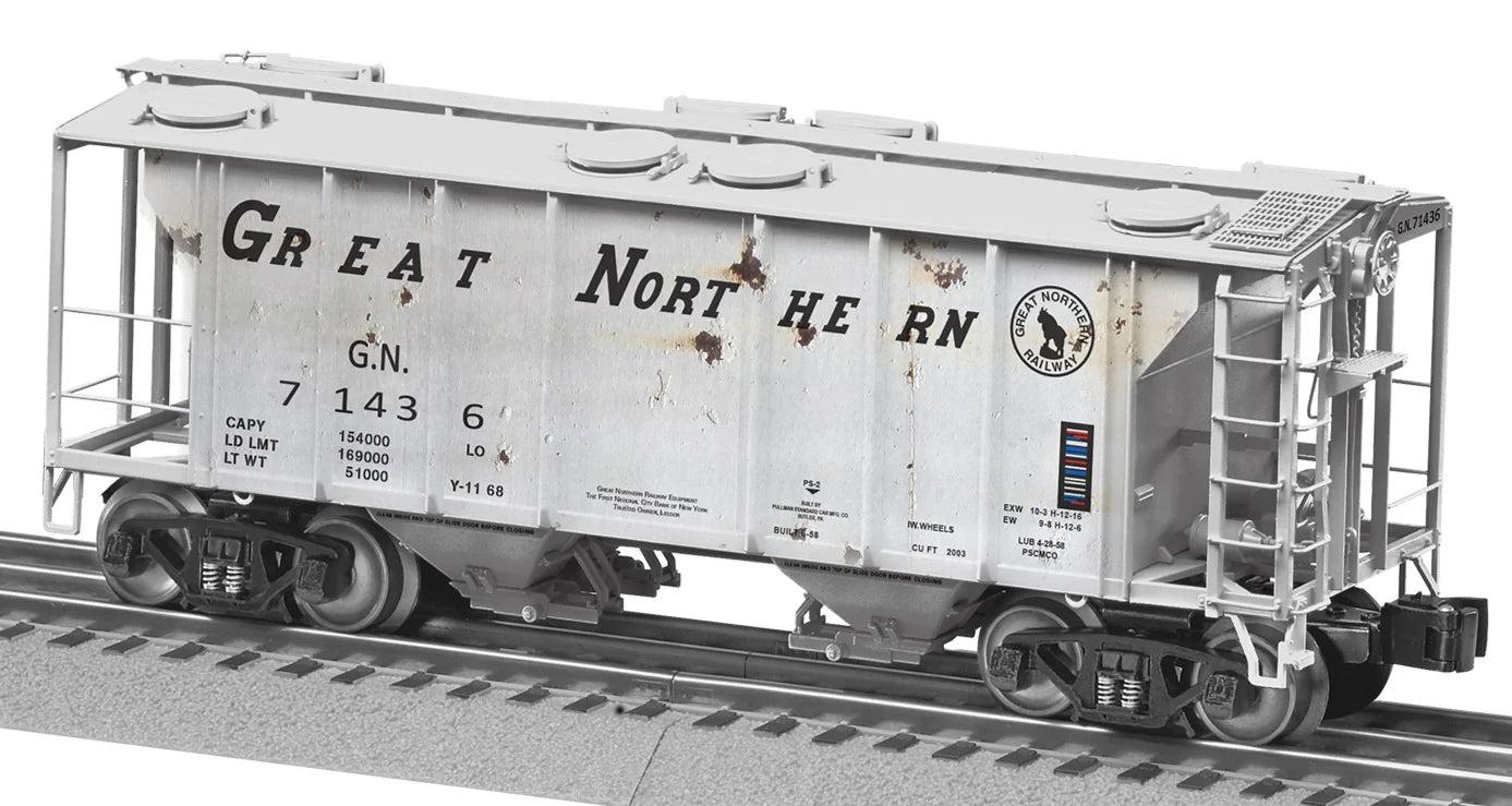 Lionel O PS-2 2-Bay Covered Hopper - 3-Rail - Ready to Run -- Great Northern #71436 (Weathered, gray, black, Small Rocky Logo)
