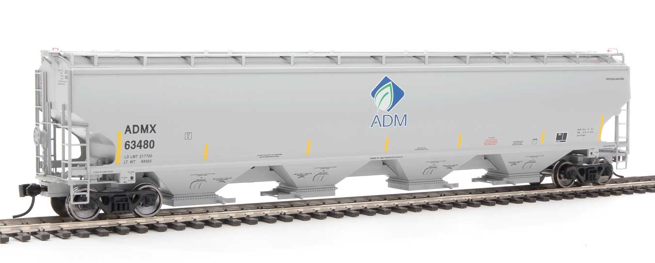 WalthersProto 67' Trinity 6351 4-Bay Covered Hopper - Ready to Run -- Archer-Daniels-Midland #63480 (gray, Leaf Logo, Yellow Conspicuity Stripes) - 920-105842