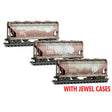 ACF 39' 2-Bay Center-Flow Covered Hopper 3-Pack - Round Hatches - Ready to Run -- BNSF Railway #406020, 406225, 406088 (Weathered, Boxcar Red, Graffiti)
