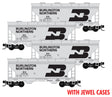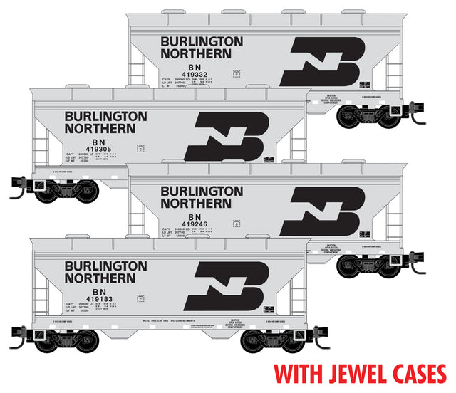 ACF 39' 2-Bay Center-Flow Covered Hopper 4-Pack, Ready to Run, Jewel Case -- Burlington Northern #419183, 419246, 419305, 419332 (gray, black, Large Logo