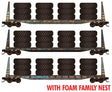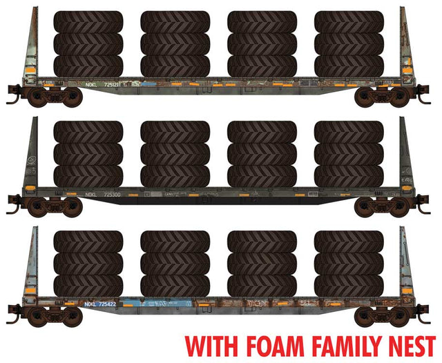 Micro-Trains N 61' 8" Bulkhead Flatcar 3-Pack w/Large Tire Load - Ready to Run - Foam Nest -- Northwestern Oklahoma #725121, 725300, 725422 (weathered, blue, yellow)
