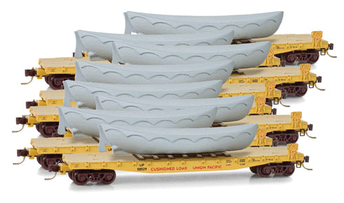 Micro-Trains 50' Fishbelly Flatcar w/Side-Mount Brake Wheel 8-Pack - Ready to Run -- With Boat Load, Union Pacific (Armour Yellow, red, gray Boats) - 489-99300805