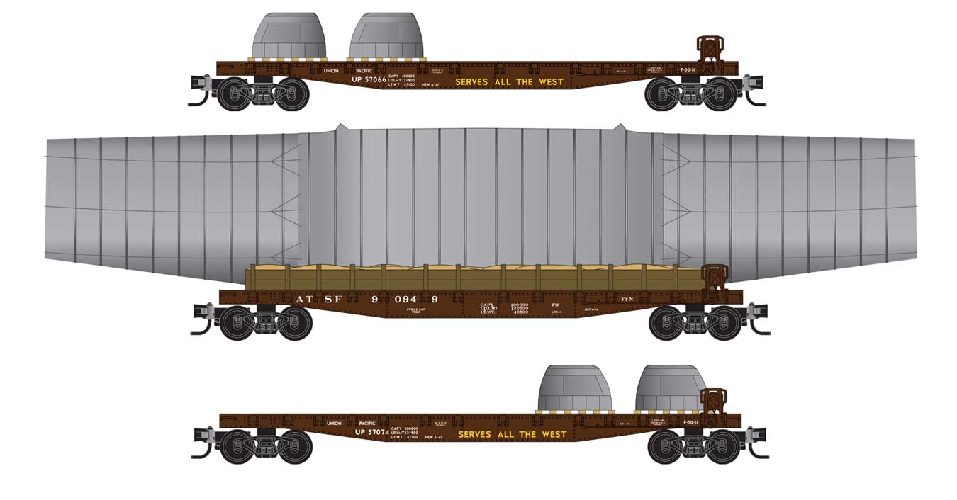 Micro-Trains 50' Wing Carrier Flatcar Set with Loads - Kit -- Union Pacific 57066, 57074, Santa Fe 90949 (Boxcar Red) - 489-99302182