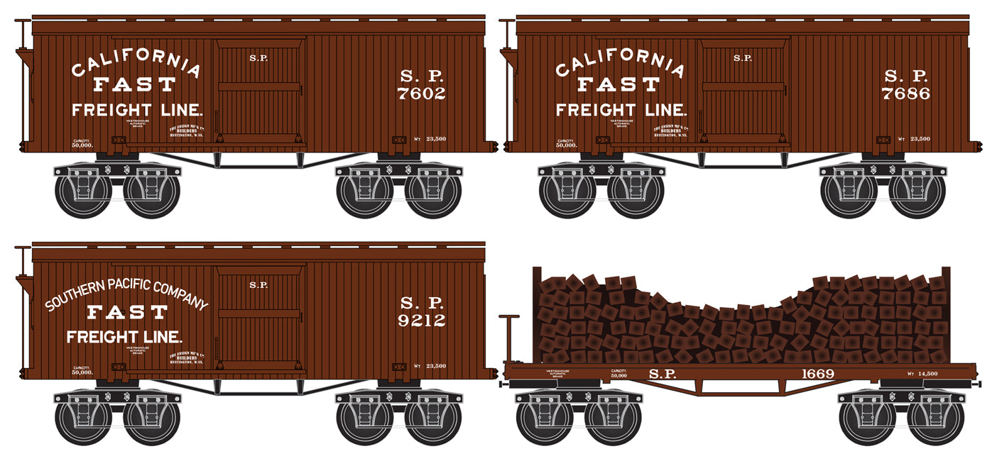 Micro-Trains Civil War Era 3-Boxcar and 1 Flatcar with Tie Load Set - Ready to Run -- Southern Pacific 7602, 7686, 9212, 1669 (Boxcar Red, Mixed Lettering) - 489-99302160
