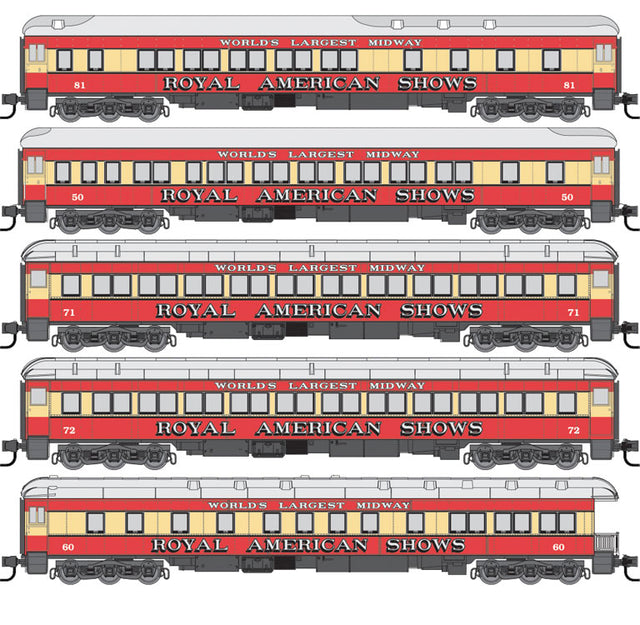 Micro-Trains Heavyweight 5-Car Set - Ready to Run -- Royal American Shows (red, yellow, white) - 489-99301300