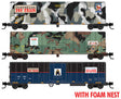 Micro-Trains 2-50' Boxcars & 51' Mechanical Reefer - Ready to Run - Foam Nest -- Toys for Tots (2 Camouflage, 1 blue, black) - 489-99302233