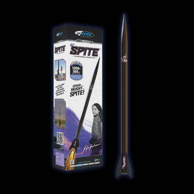 Meet the Estes Pro Series II Lil’ Spite, a bold new rocket that combines cutting-edge design with high-performance engineering. Created in collaboration with engineer and YouTube star Xyla Foxlin, Lil’ Spite is a mid-power adaptation of her original high-power rocket, Spite. With its sleek profile, carbon fiber-inspired decals, and precision-cut plywood fins, this rocket is built to impress on the launch pad and in the sky.