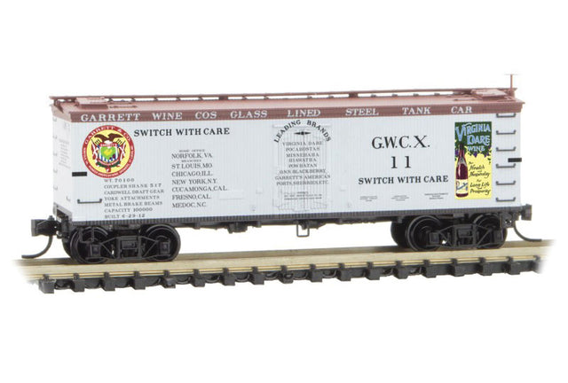 Micro-Trains 36' Wood-Sheathed Ice Reefer - Ready to Run -- Garrett Wine Company GWCX 11 (white, Boxcar Red, yellow, Grape to Glass 10) - 489-5800596