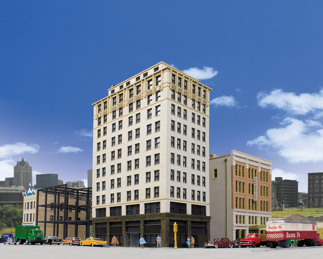 The Walthers Cornerstone HO Scale Ashmore Hotel is a high-rise structure that's ideal for any downtown or big city layout scene. This 11-story building features a granite facade and ornate trim. It's easily customized using three street-level facades that represent the early 1900s, the 1950s and the modern era making it great for steam or diesel-era layouts. Modular design also allows you to combine kits for a longer, wider to taller model and it can also be built as a background structure against your painted or printed backdrop scene to add depth.