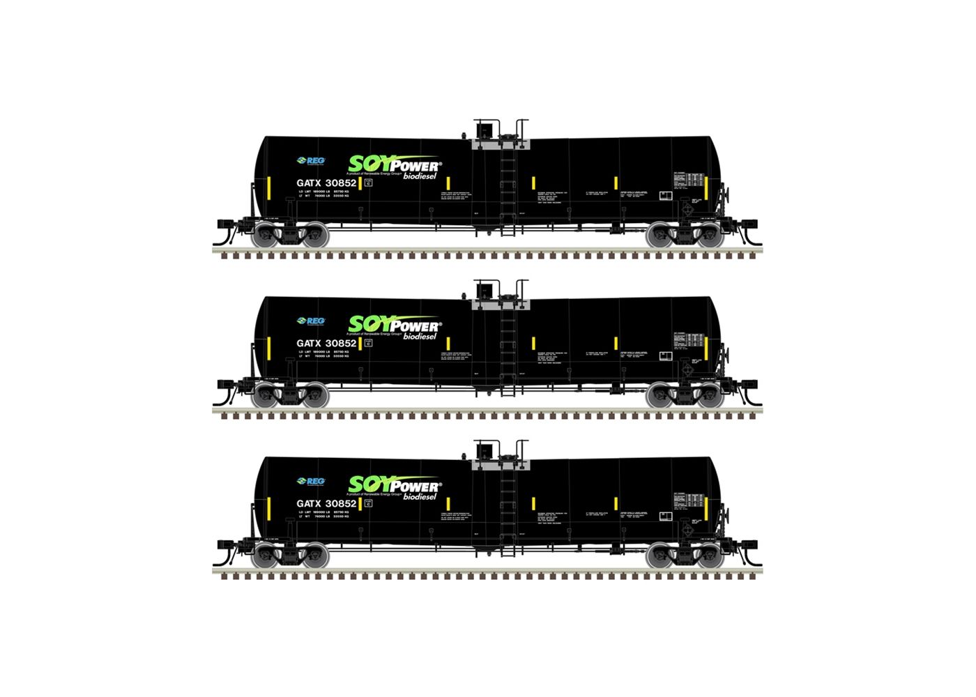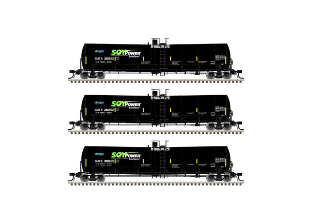 Atlas N Trinity 25,500-Gallon Tank Car 3-Pack - Ready to Run -- Soy Power Bio Fuels GATX #30839, 30844, 30852 (black, blue, green, white)