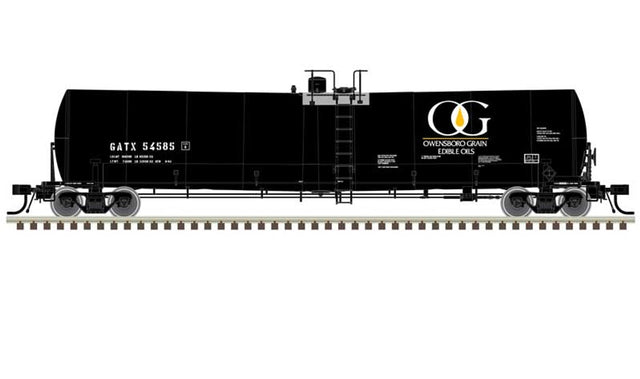Atlas N Trinity 25,500-Gallon Tank Car - Ready to Run -- Owensboro Grain GATX #54553 (black, white, yellow)