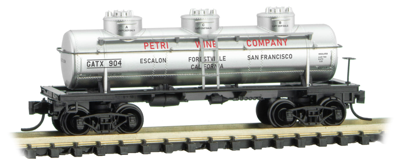 Micro-Trains 3-Dome Tank Car - Ready to Run -- Petri Wine Co. GATX 904 (silver, black, red, Grape to Glass Series 8) - 489-6600130
