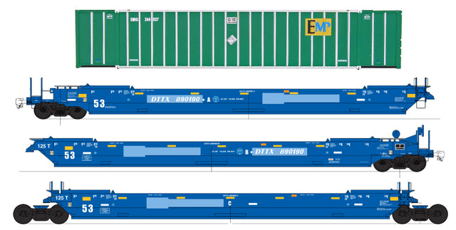 Intermountain HO Maxi IV Stack 3-Car Set w/6 53' Containers- Ready to Run -- TTX DTTX (Ex-BRAN, Patched, blue, white, EMP Containers)