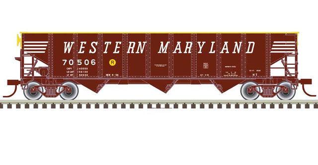 Atlas AAR 70-Ton 9-Panel 3-Bay Open Hopper, Standard Ends and Load - Ready to Run -- Western Maryland #70002 (Boxcar Red, yellow, white) - ATL20006923
