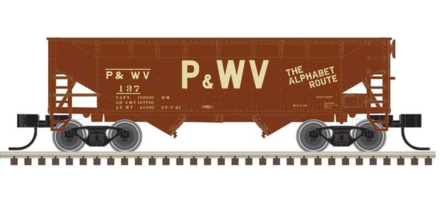 Atlas N 2-Bay Offset-Side Hopper with Flat Ends & Load - Ready to Run - Master(R) -- Pittsburgh & West Virginia 154 (Boxcar Red, tan)